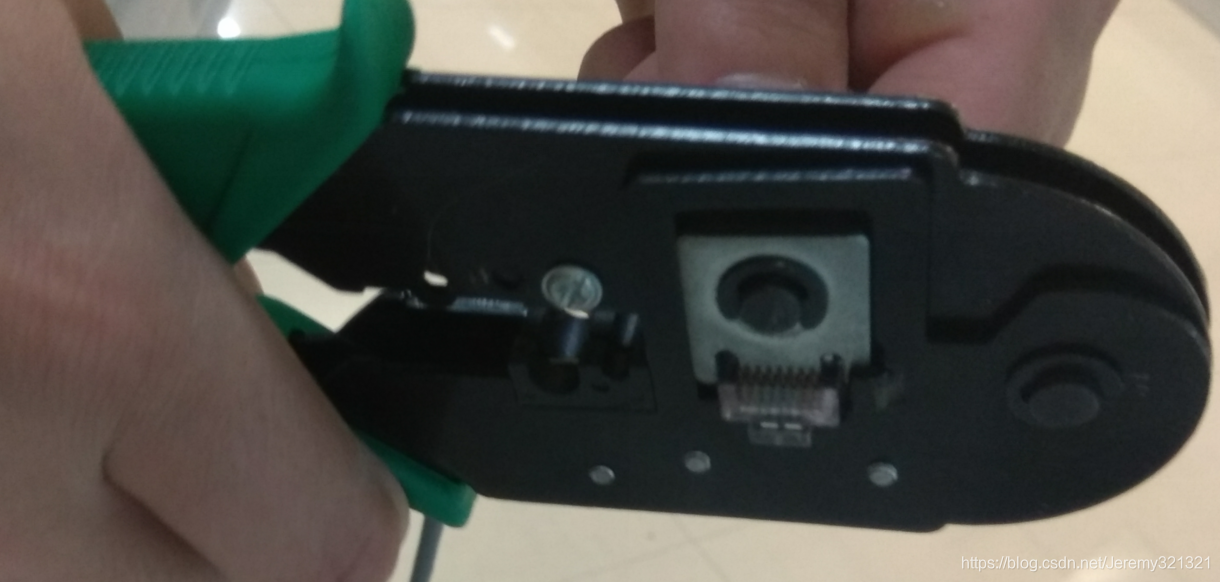 (4)将双绞线整齐的插入到RJ-45接头中(塑料扣的一面朝下,开口朝右);