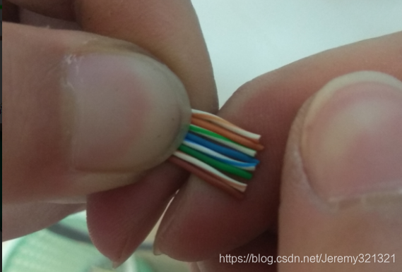 (1)将双绞线从头部开始将外部套层去掉20mm左右,并将8根导线理直;