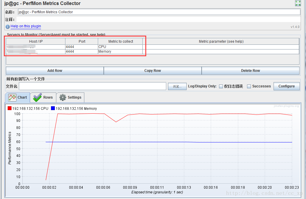 在服务端运行serverAgent,选择监听器中的对应项,配置相应的在地址,端口号,选择需要监控的项,例如CPU、内存等,线程组运行时会绘制图表。
