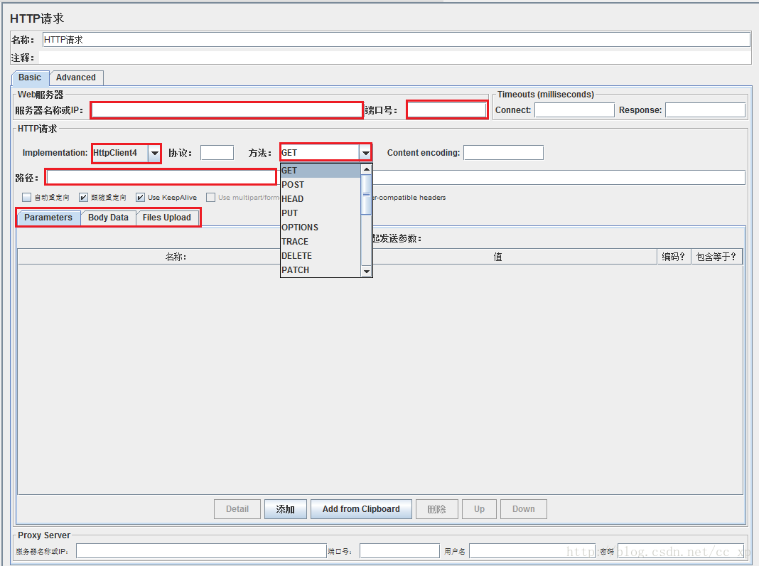 添加sampler下http请求组件,服务器名称或IP处填入域名或者IP地址,端口号填入对应端口号,根据具体的请求选择请求类型,写入对应URL,有参数情形下选择参数类型并填入相应参数。需要自定义请求头时,在配置元件中选择HTTP信息头管理器。
