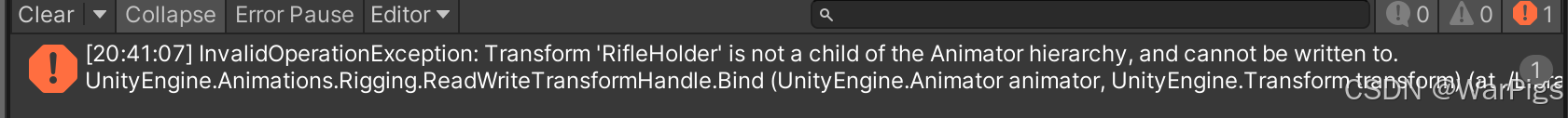 然后我猜想是因为这个动画事件所在的animator不是这个Multi Aim Constraint的父级,于是给这个animator节点加了一个RigBuilder,下面加了Rig,把Multi Aim Constraint放在下面,然后出现下面的报错: