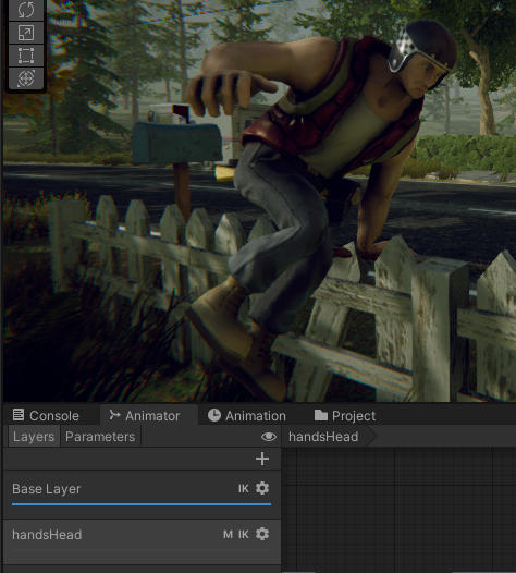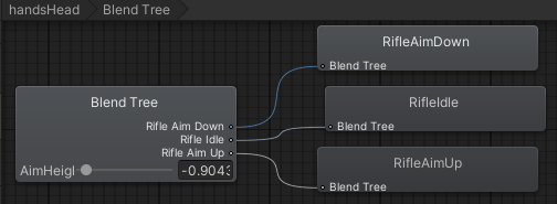 动画状态机有4层:移动、手和头(瞄准层)、骑马、交互。瞄准层覆盖了双臂和头。