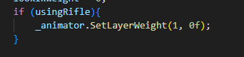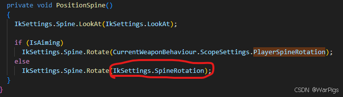 IsAiming的维护:在LateUpdate()执行的UpdateSpineIK()里把NeedToUseSpineIK()的结果写入NeedToUseSpineIK()里面写在人物活着&&没有跑步&&没有扔手雷&&没有空手&&没有开载具时为true。也就是在跳跃中、空中是可以瞄准的。