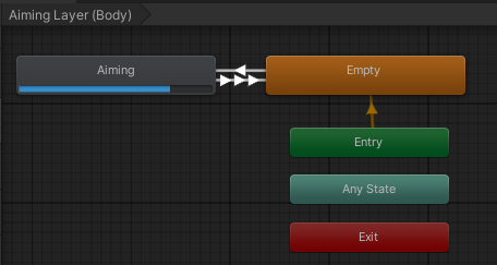 第二层瞄准层使用了覆盖上半身的AvatarMask。跑步的时候进入Empty状态,里面无动画。也就是跑步是放在Base层,上层置空,没有用上下半身叠加。跳的时候会回到Aiming。