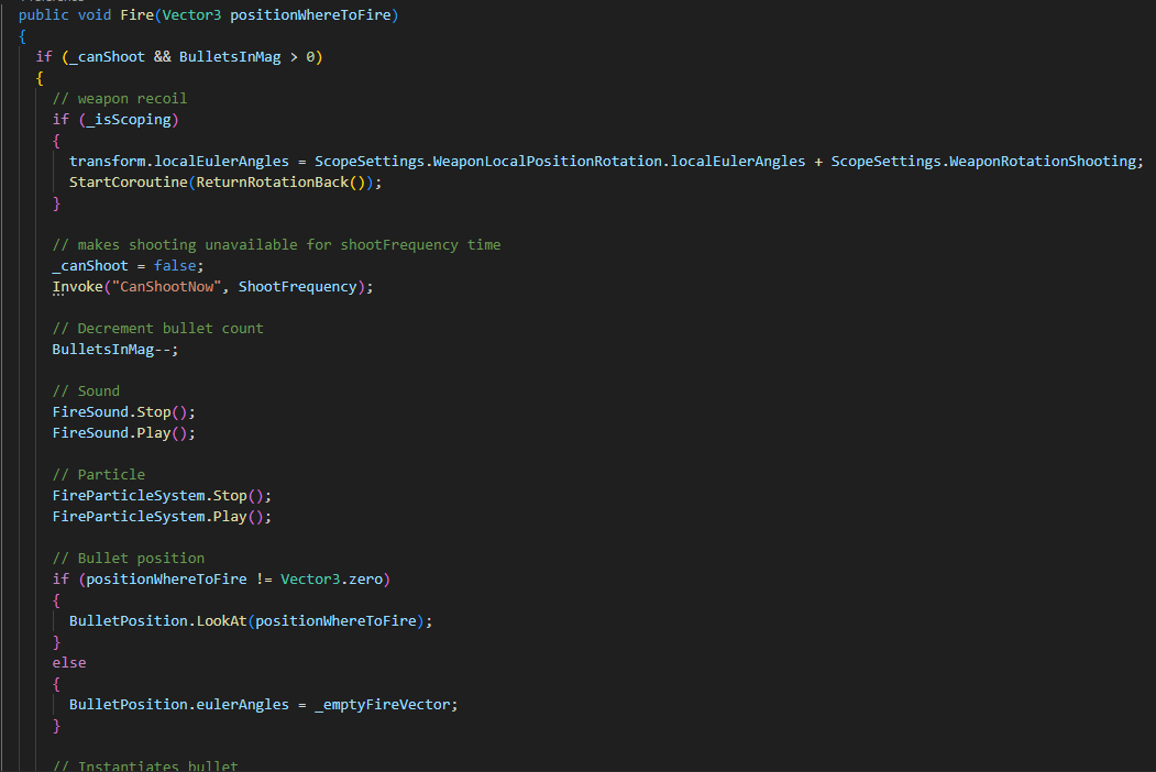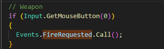 Fire()函数,里面执行了武器Fire(),调用了PlayerFire事件,这个事件的订阅函数有相机抖动和更新子弹数UI。
