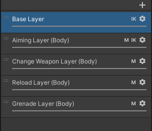 换枪、换弹、扔手榴弹各加了一层,AvatarMask都是上半身。虽然我觉得这些动作是互斥的,可以和Aiming放在一层。