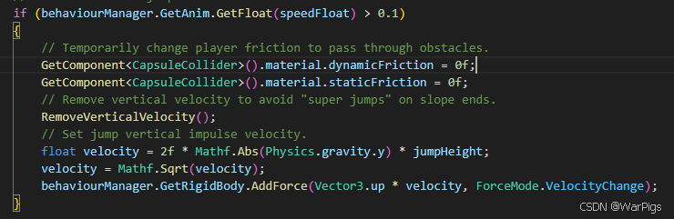 跳跃的向上移动是通过rigidbody.AddForce()实现的。我们已经知道这样贴着物体跳跃会受到摩擦跳不起来,为了避免这个物体在起跳瞬间竟然把碰撞体的物理材质的动摩擦和静摩擦设0,跳完再设回去。