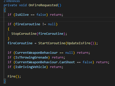 看一下IsFire是干什么的。它表示人物正在射击,用来1.在人物跑步中开始射击时打断跑步;2.被GetNoise使用,Noise其实是玩家会被敌人发现的距离。距离小于Noise时玩家被发现。那么那个停止、开启协程的作用就是让玩家开火中、开火结束2帧后有一个相应的被发现距离。