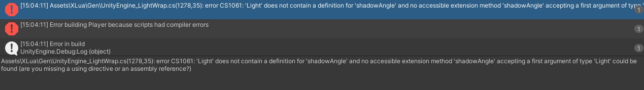 AB包打包报错XLua\Gen\UnityEngine_LightWrap.cs:error CS1061:'Light' does not contain a definition for shadowAngle