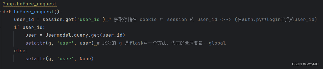 在定义answer的时候,author_id绑定了全局变量g.user,还记得上次写的钩子函数吗,对全局变量进行了一个定义,在我们评价问题的时候,如果处于未登录状态应该是没有author_id的,但是数据库中任然会添加数据,不过绑定关系的作者id就是None,让我们回顾一下: