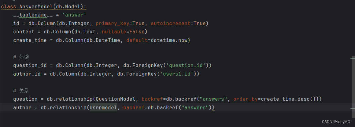 这里有两个外键,分别是问题id和作者id,在发布问题时需要在指定的位置显示出相关的id,就是在问题页面有显示,而其中还有关系需要有发布者的相关内容,也就是对于一个问题而言要有发布者和回答者,这两者就在数据库设计时进行添加;