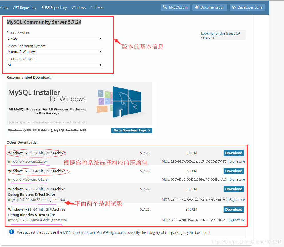 点击MySQL Community Server 5.7.26,就可以进入到以下页面
