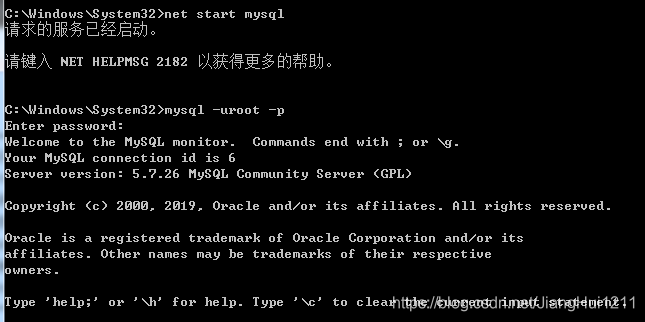 在cmd中接着输入:>net start mysql ,这个时候回提示服务启动成功,接下来启动MYSQL,输入:mysql -uroot -p,回车会提示我们输入密码,由于我们在前面安装的时候没有设置root密码,所以这个时候什么都不用输入,直接按回车键,就会出现下面的结果。