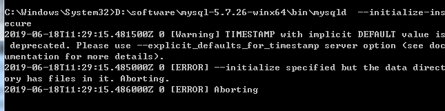 在之前的压缩文件路径下初始化生成data文件夹,运行D:\software\mysql-5.7.26-winx64\bin\mysqld --initialize-insecure,使用这种安装不用设置root密码,而mysqld --initialize (不建议使用,生成一个随机的root密码)。下面表示正常运行结果,若报错,请检查自己的配置文件中的两个目录是否有问题。