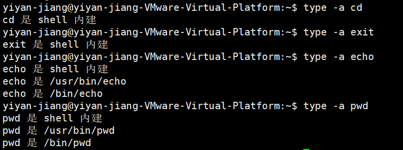 echo和pwd既有内建命令也有外部命令。两种实现略有不同。要查看命令的不同实现,使用type -a。which命令只显示出了外部命令文件。