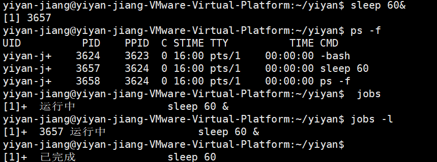 (60s后,再按回车键,显示后台运行的sleep命令已经运行完成)