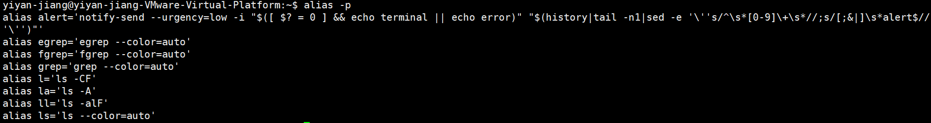 alias –p 命令可以查看你所使用的Linux发行版已经为你设置好的一些常用命令的别名