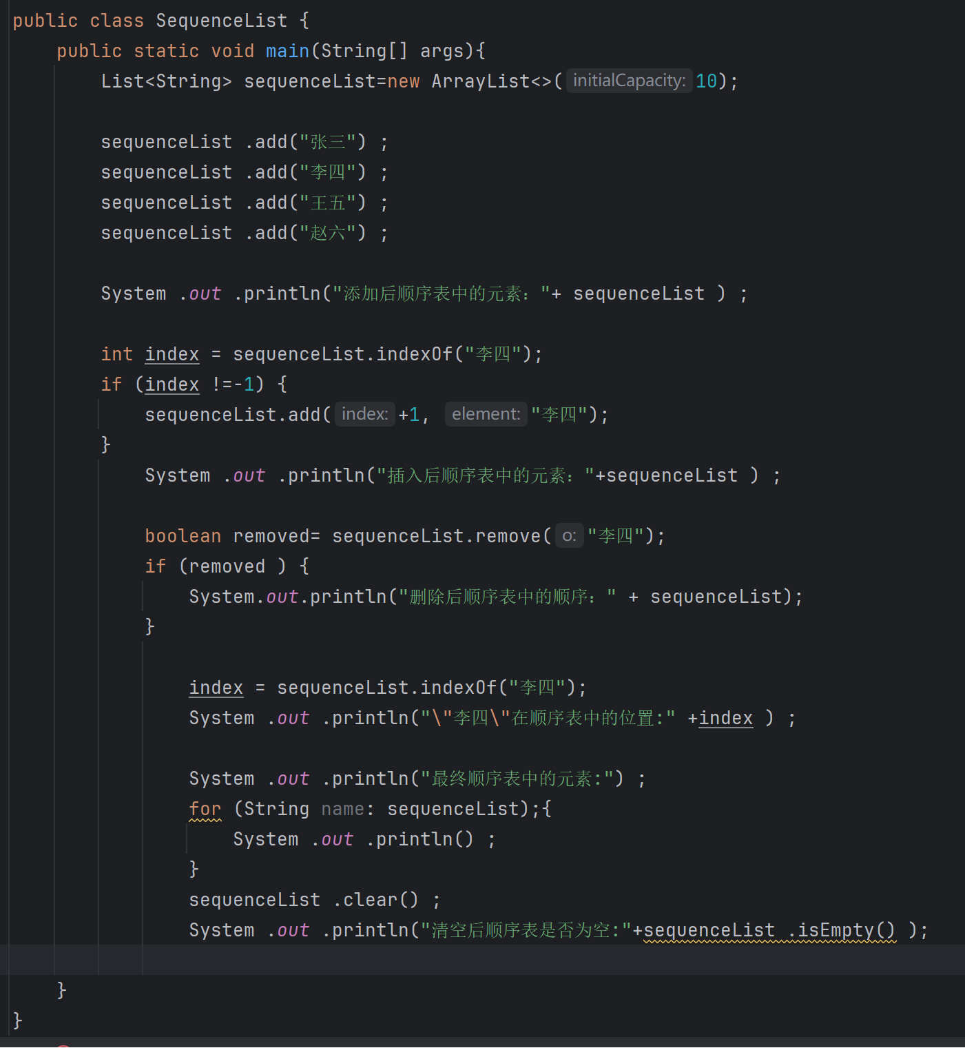 假设你正在开发一个简单的学生管理系统,使用顺序表(SequenceList)来存储学生姓名。请完成以下任务: