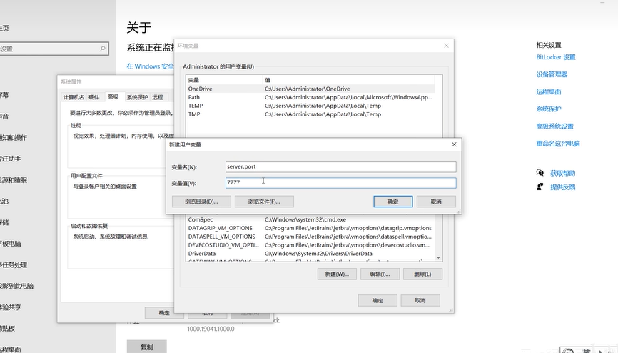在系统环境变量中添加,变量名为server.port 变量值为7777,如果继续在之前的cmd端口运行jar包,端口不会修改,需要重新开启一个cmd窗口运行