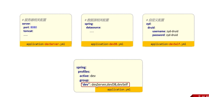 在application.yml中使用spring.profile.group定义分组,使用spring.profile.active在application.yml中激活分组。