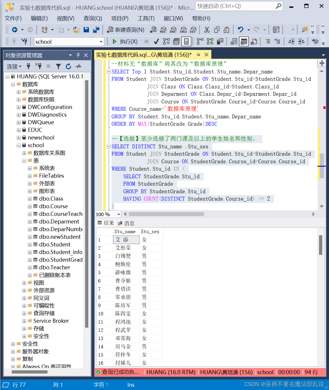 9.【选做】至少选修了两门课及以上的学生姓名和性别。