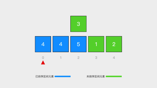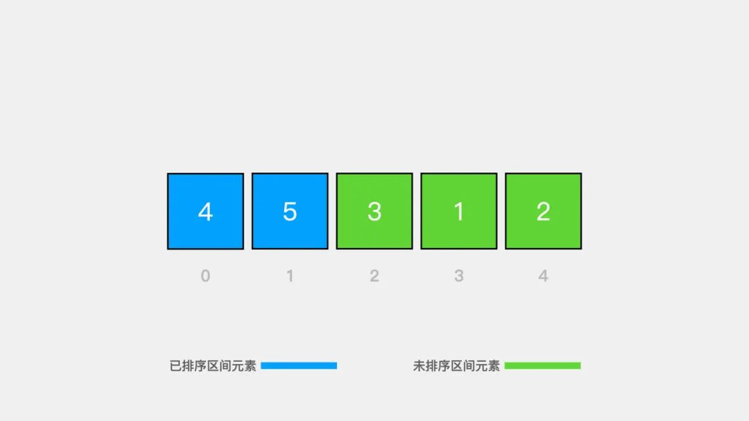 初始状态是这样的。即已排序区间的元素是4和5,未排序区间的元素是3、1、2。