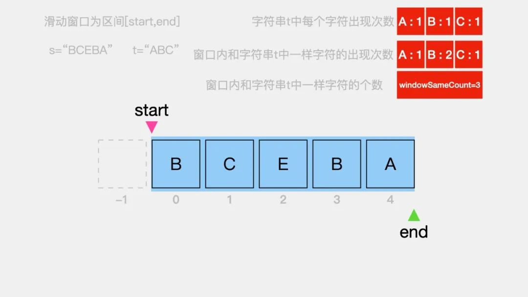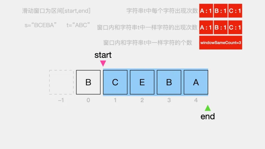 接着,要做的就是移动指针start来缩小窗口左侧边界。看窗口内的字符串是否依旧可以覆盖字符串t="ABC"。