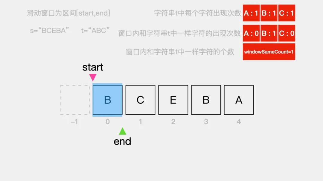 首先,向右移动指针end来扩大窗口右边界。在扩大窗口边界后,窗口内字符B的出现次数更新为1,同时该字符在字符串t中有出现,因此更新windowSameCount为1。