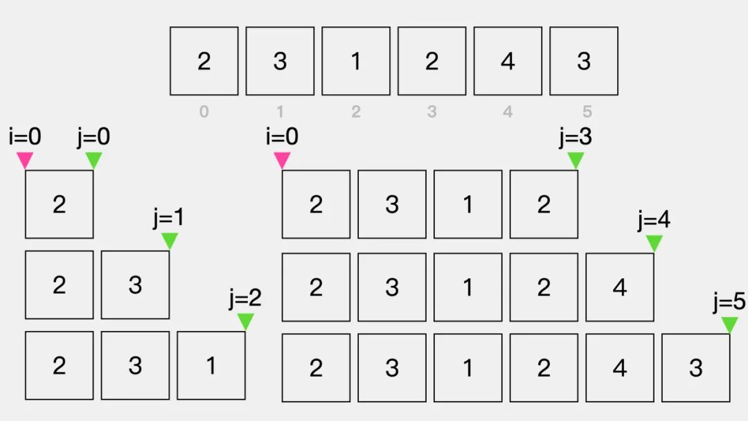这一点其实正是上面提到的暴力解法双重for循环的不足之处,即双重for循环会存在冗余的计算。如下图,最后两次计算,即j=4和j=5,在i=0时,是没必要参与计算的。