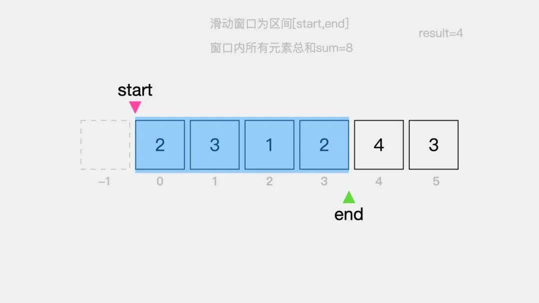 如下图,当指针end指向索引3的位置时,窗口区间[0,3]内的元素2、3、1、2总和为8大于目标值s=7,因此需要更新result的值为4。