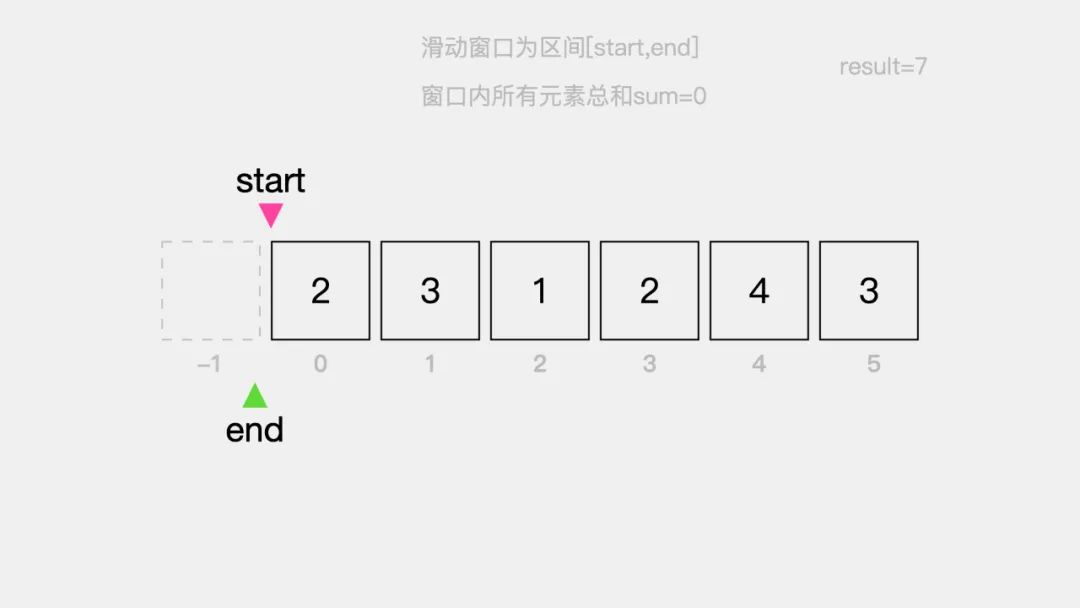 需要注意的是在这里,滑动窗口的起始位置start=0,结束位置end=-1,表示,初始状态下窗口中没有元素,因为区间[0,-1]并不存在。result的初始值给定数组长度加1。