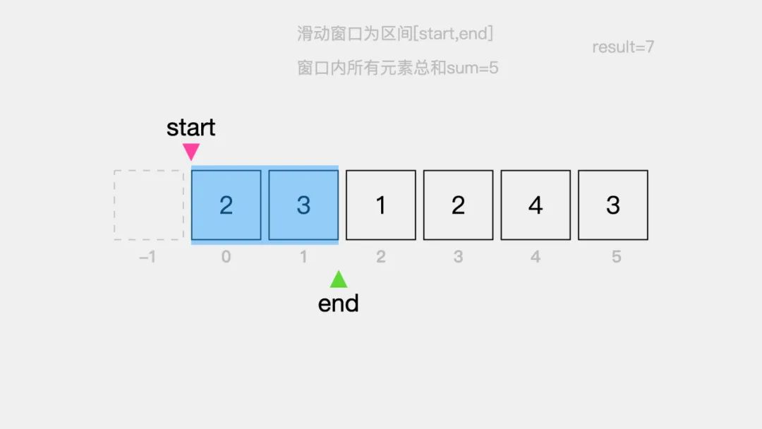 由于sum=2小于目标值s=7,因此需要继续扩大窗口右侧边界,即指针end继续向右移动一个位置。这时,窗口区间为[0,1],窗口内元素是2,3,即sum=5。