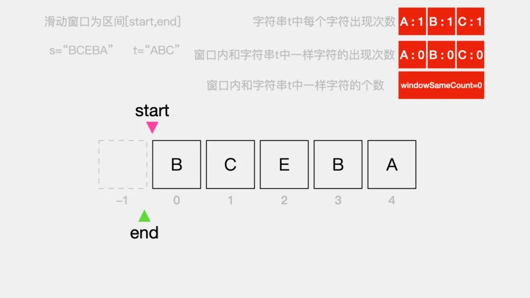 这里为了方便讲解,我们以字符串s=“BCEBA"和字符串t=”ABC"为例来看一下滑动窗口的具体实现过程。