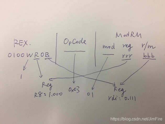 REX | OpCode | ModRM 0100 WRXB mod reg r/m 0100 1100 0x03 01 1.000(r8) 0.111(rdi,1和0之后打点表示R位置1扩展了寄存器的位数)