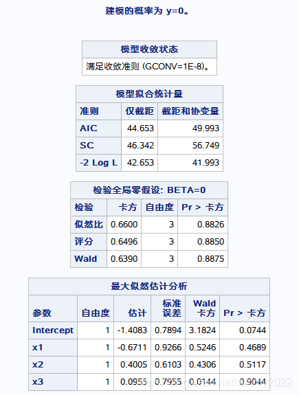 建模的概率是y=0,并且给出了各参数的极大似然估计值。
