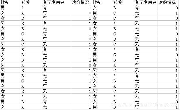 下表为医院统计的A、B、C三种药物对病人治疗情况,试建立Logistic回归模型。