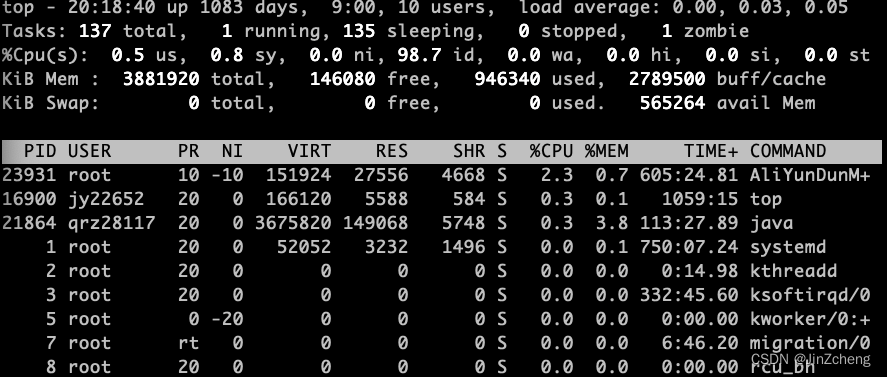 - free 当前的内存情况 默认展示单位为kb的内存信息, 可以使用关键字-g -m来展示gb和mb的信息