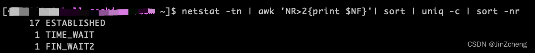 netstat -tn | awk 'NR>2{print $NF}'| sort | uniq -c | sort -nr