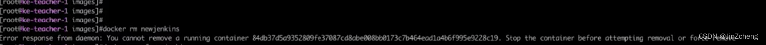 需要注意的是该命令只能删除不在运行状态的容器,如果使用该命令尝试删除运行中的容器,则会报错: