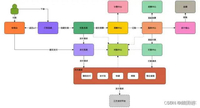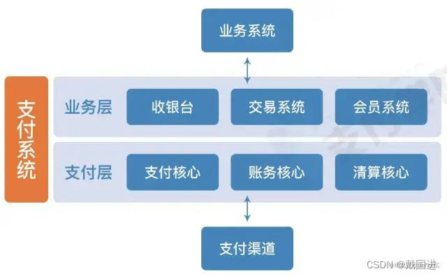 支付系统的主要职责是处理业务系统发起的所有交易请求,包含收银台、交易系统、支付核心等模块,根据各模块不同的功能职责,可以将支付系统分为业务层和支付层两部分。
