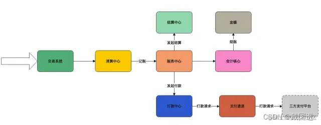 另外支付成功后还有一条线清结算线:支付成功以后交易将数据提交清算中心完成数据的清分计算,然后提交账务系统完成记账;再通知会计核心完成内部账的记录;最后通知资金平台对交易向商家进行货款的结算……