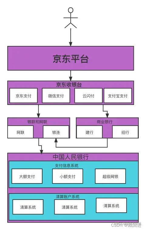 最后到达我们的中国人民银行,也就是我们常说的央妈!绝对的食物链的顶端,所以一笔小小的支付都是经过这么多的参与方的