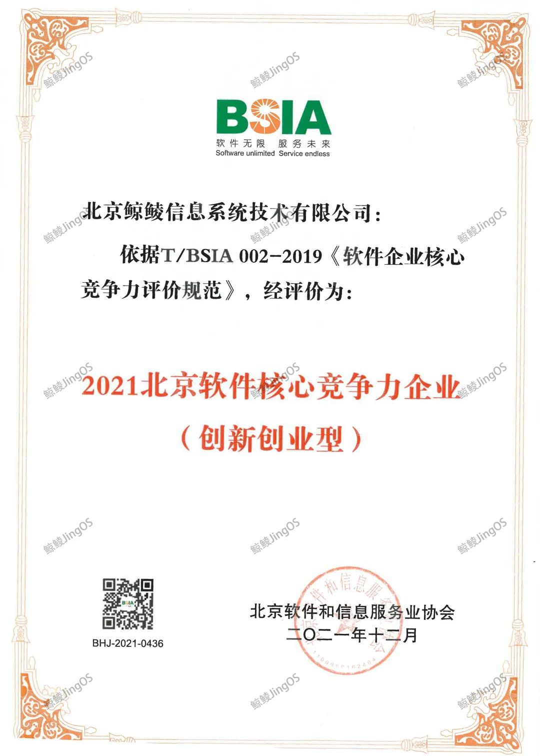 近日,北京软件和信息服务业协会(以下简称:北京软协)发布了《2021北京软件企业核心竞争力评价报告》,鲸鲮科技凭借在国产移动操作系统方面的科技创新成果与综合服务实力,荣获“2021北京软件核心竞争力企业(创新创业型)”评价。