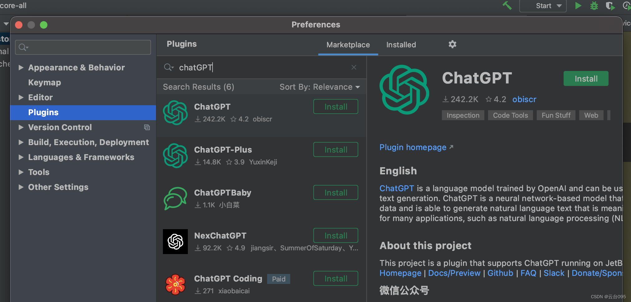 在插件市场搜索 chatGPT, 点击安装