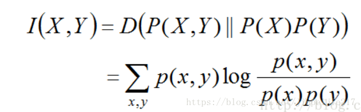 两个随机变量X,Y的互信息,定义为X,Y的联合分布和独立分布乘积的相对熵。