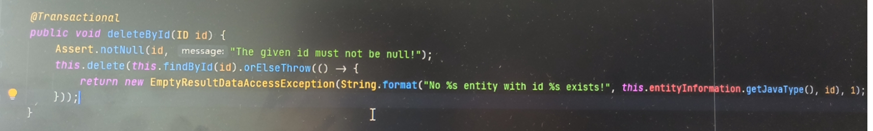 通过查看源码发现,在使用JPA的 deleteById(id) 时,默认实现会通过 findById(id) 查询实体,如果找不到,就会抛出异常而不是静默忽略。