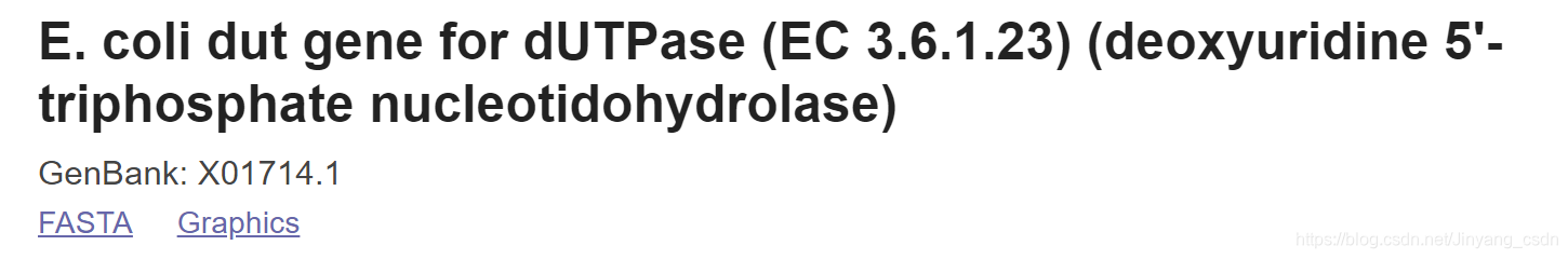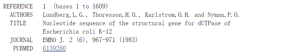 以dut基因编码的大肠杆菌酶dutpase为例;在Nucleotide数据库search X01714或者dutpase,检索链接https://www.ncbi.nlm.nih.gov/nuccore/x01714;得到以下信息。