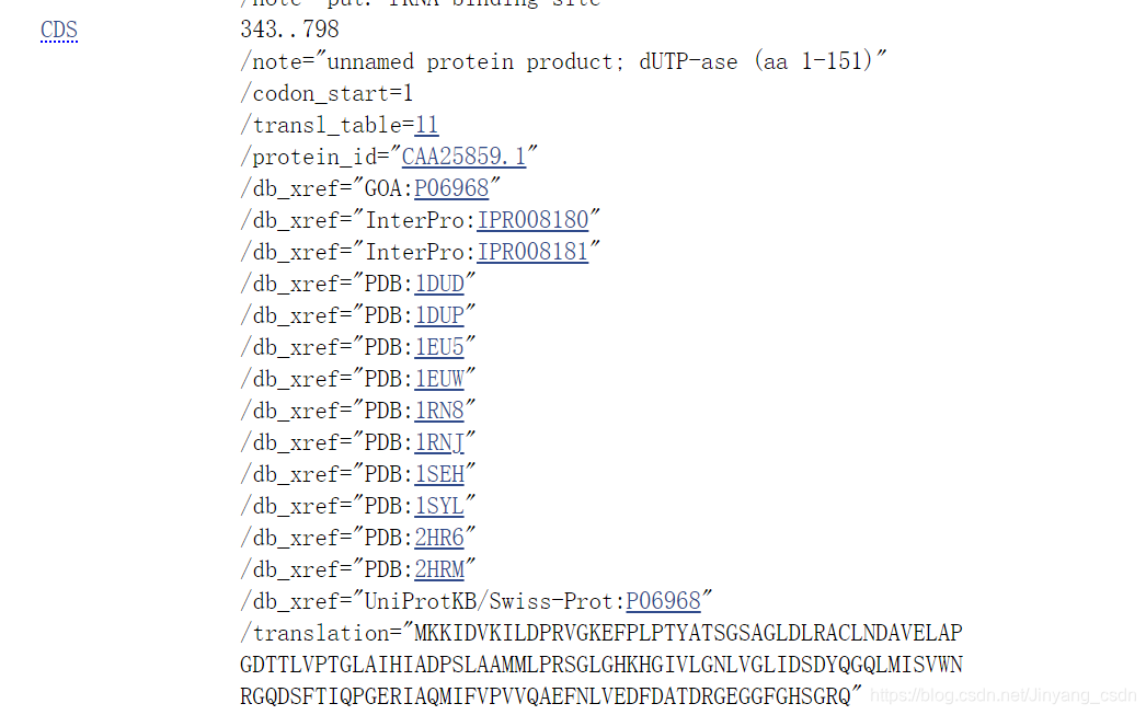 - Coding segment CDS:有计算机根据翻译密码本自动翻译而来,中间翻译出来的蛋白质在各种蛋白质数据集中对应的检索号