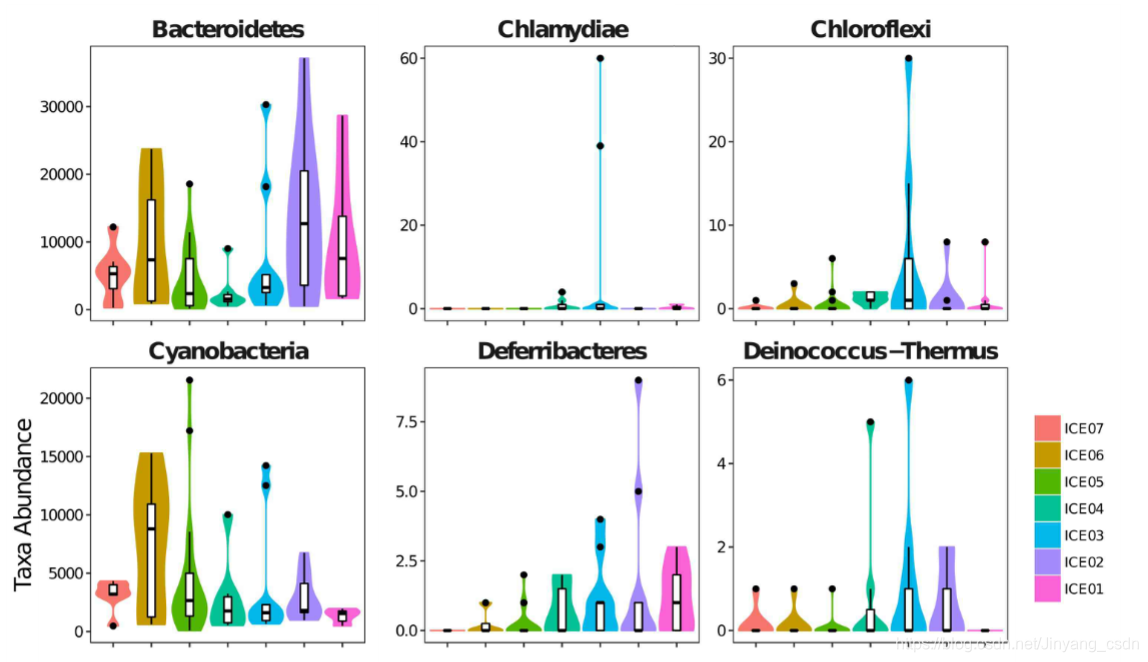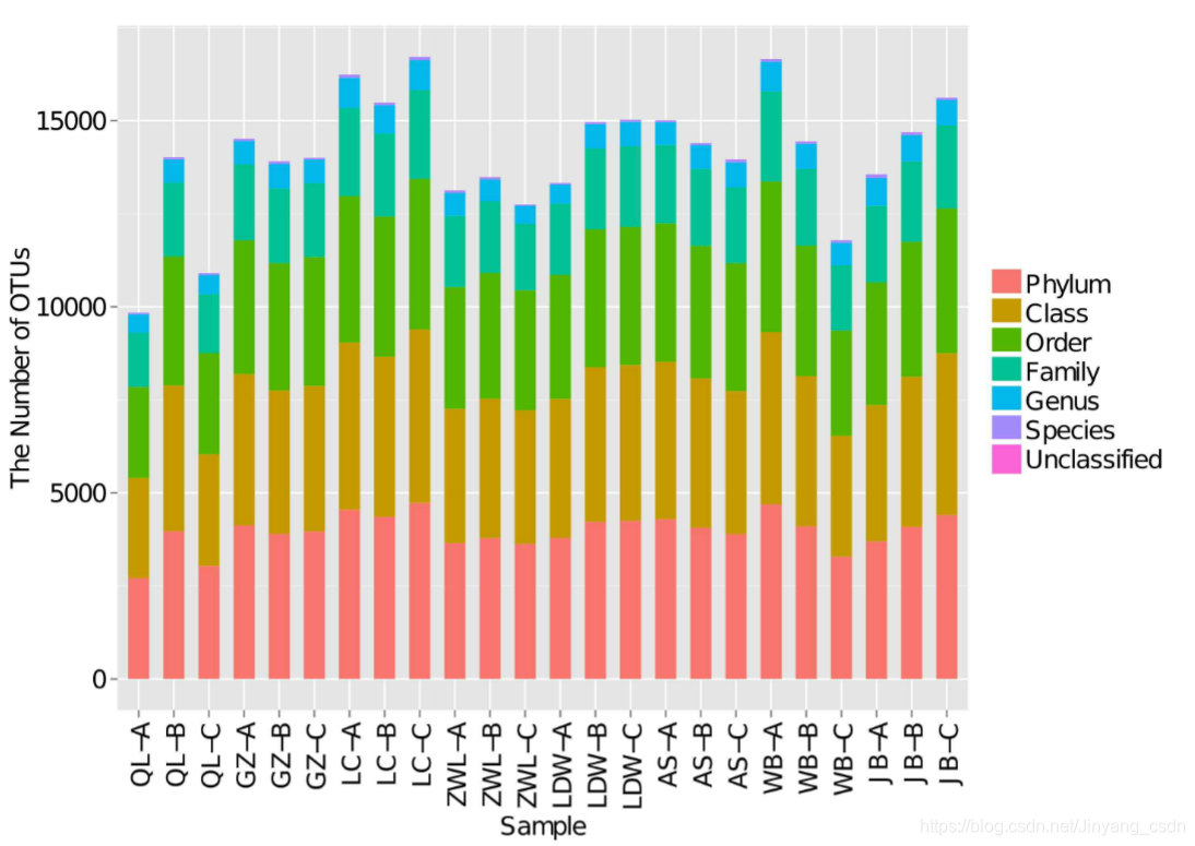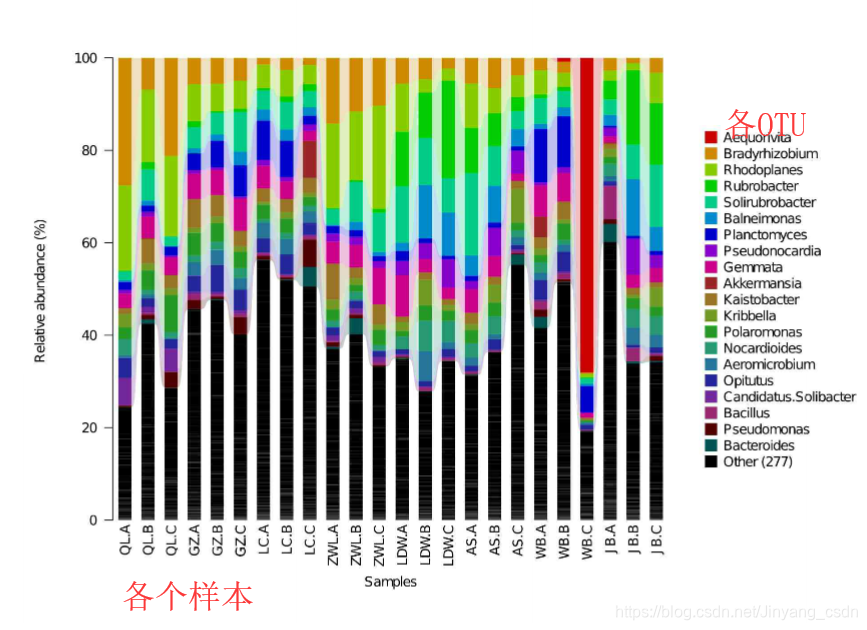 纵坐标为各个OTU的相对丰度,越长表示相对丰度越高