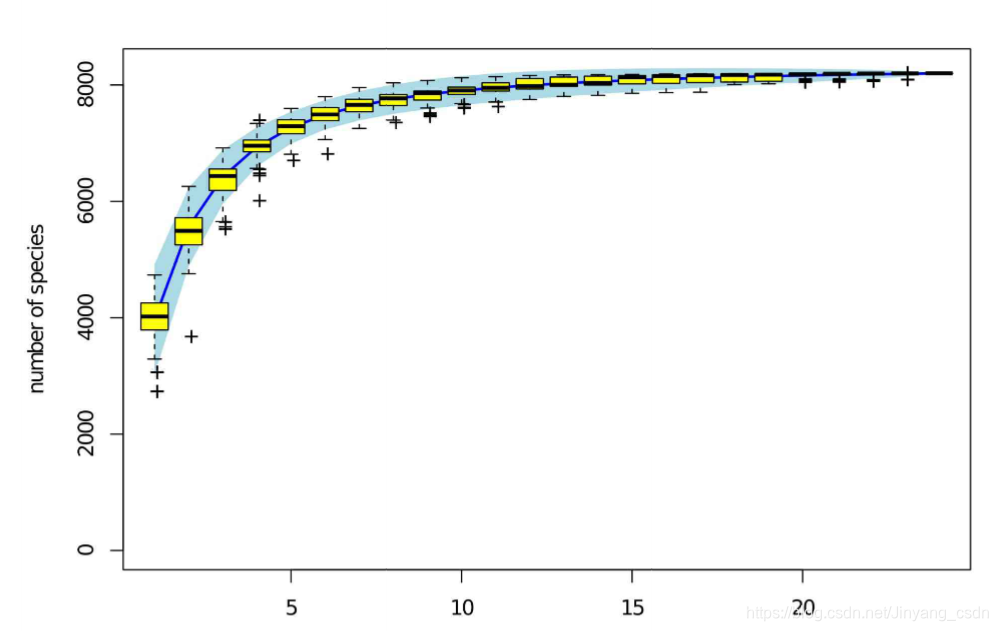 Specaccum物种累积曲线分析,不断增加样本数目,进行OTU划分,OTU数据稳定,则达标;随机抽取不同的固定数目的samples,划分OTU,得到OTU 数目的均值,极大小值,上下边缘,绘制盒图,按照一定规律(递增)改变samples数目,再多次抽样,制作OTU盒图。该图像能描述样本采样的充分性与物种丰富度。